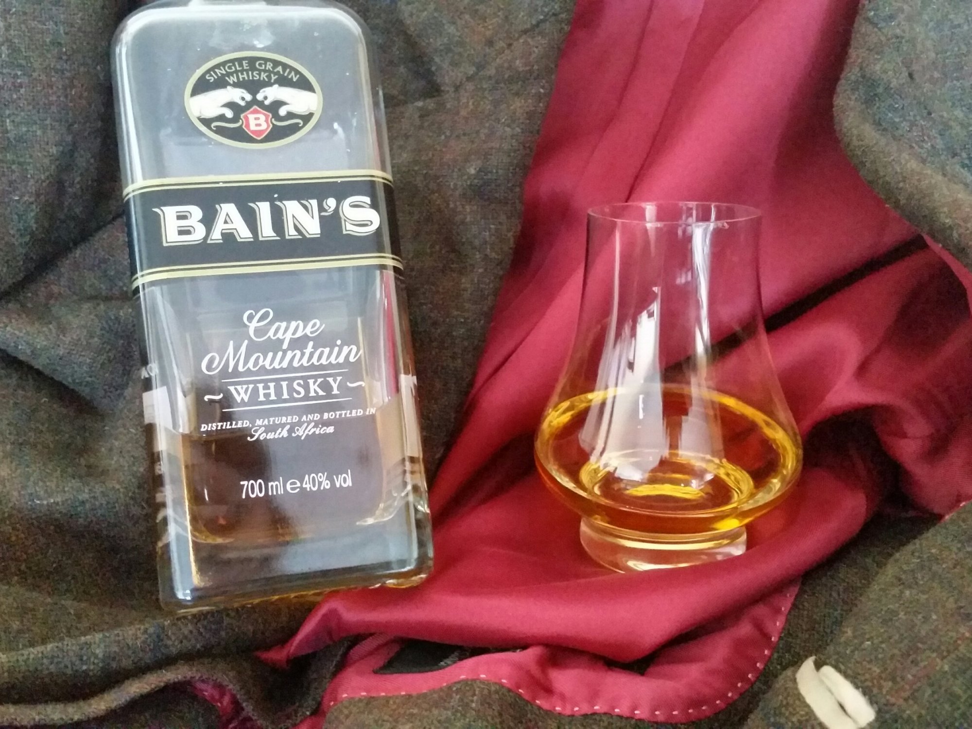 Another Wednesday, another chance to explore the wonderful world of whisky. This week we’re looking at South Africa, specifically the Bain’s Single Grain Cape Mountain Whisky out of The James Sedgewick Distillery. Now James Sedgwick distillery originates back to the late 1800’s, when Captain Sedgwick passed away and his two sons opened a distillery in Wellington. The distillery kept going for years and years, never gaining much recognition outside of South Africa until Andy Watts, formerly of Morrison Bowmore Distillers, took over as Distillery Manager in August of 1991, the same year Somewhiskybloke came into the world. The Bain’s Single Grain, first of its kind in SA, is distilled of 100% South African Yellow Maize, before being matured in first fill ex-bourbon casks for three years, and then being re-racked into different first fill ex-bourbon casks for another two years. As you can expect, this packs the whisky out with flavour, and really makes a difference, but more importantly is the temperature. Wellington is a hot place, the temperatures reaching 40 degrees and above during summer time, giving staggering 5% angels share. All this, and the whisky costs only £30 a bottle. Now let’s get our nose into the glass and see what Bain’s has to offer…
