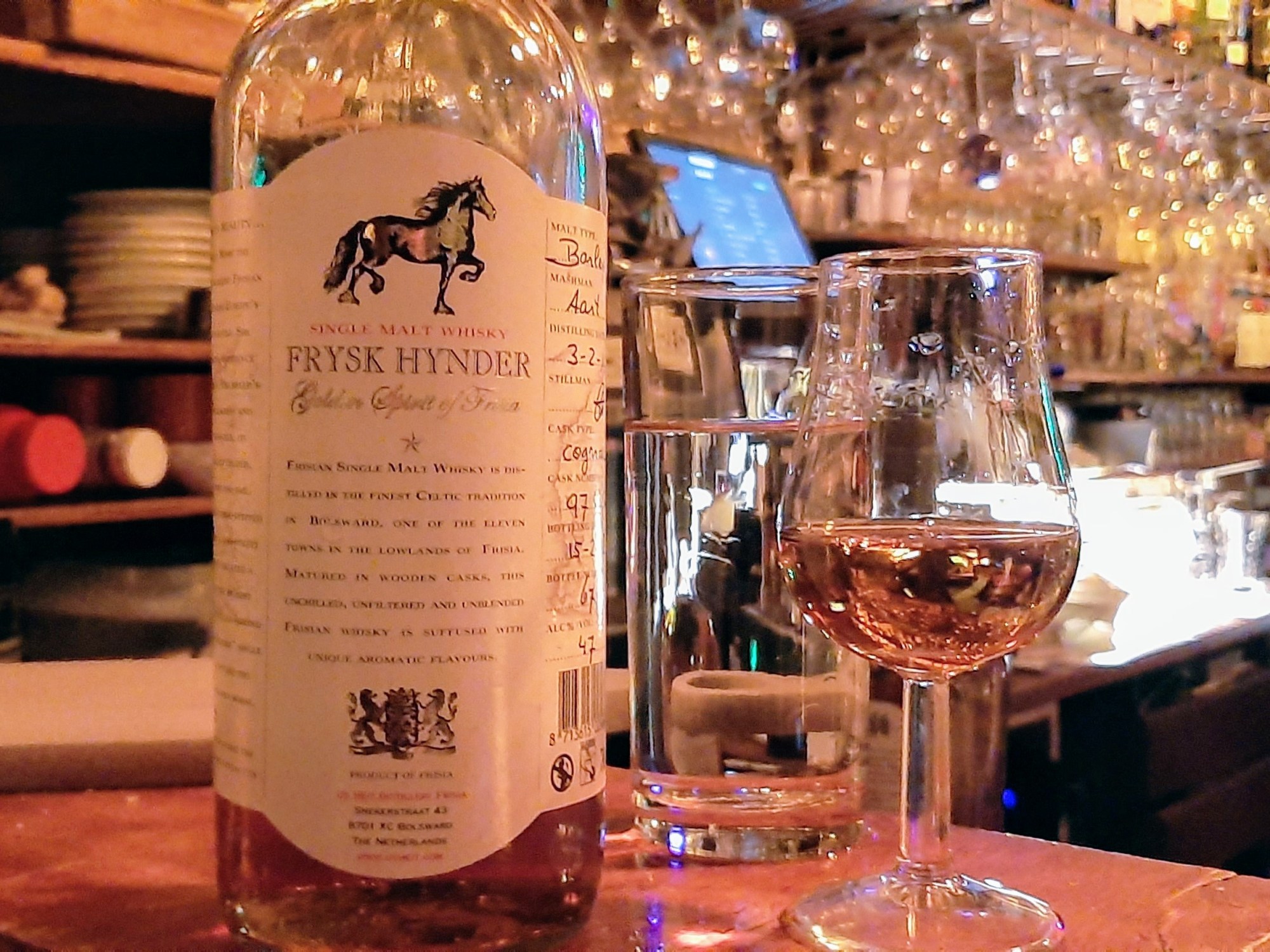 While the distillation is small (the distillery produces some 10,000 bottles annually), these cask expressions have seen quite an interest and help the distillery to showcase a variety of flavours. What I had recently was the Cognac Cask variant; single malt, distilled on the 3/2/2011 and bottled 15/2/2018, matured exclusively in ex-cognac casks and bottled at 47%. If you squint at the picture you can see that this is bottle number 67, though I could not find how many bottles were produced. While I understand that this batch has run out, I would encourage anyone making a trip to The Hague to stop through ‘Huppel the Pub’ where I sampled the whisky (I also had an interest argument with a staunch Leave Brexiteer about the worth of world whiskies, I can only imagine he has been asked to leave the country), and would thoroughly recommend them to anyone looking for a wide range of whiskies to dive into, but first, lets dive into this glass.